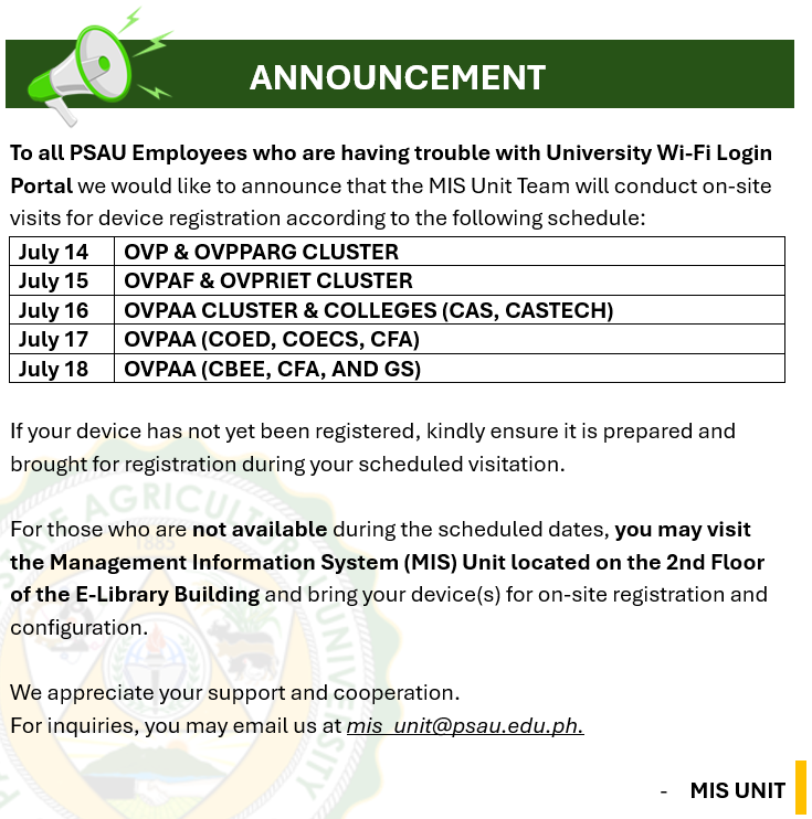 As part of our continuing efforts to enhance internet services and conduct user account maintenance and cleansing, the Management Information System (MIS) Unit is implementing changes to the University Wi-Fi access system in preparation for the upcoming opening of classes.